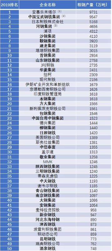 2019年全球50大鋼鐵企業排行榜發布(我的鋼鐵 中國冶金報)發布日期:2020-06-05